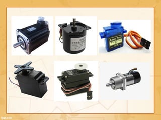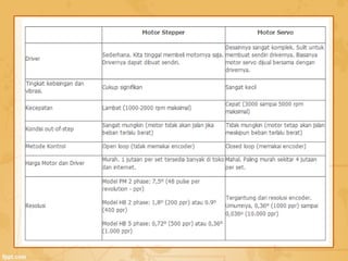 Dokumen tersebut membahas berbagai jenis motor listrik dan pompa yang digunakan dalam aplikasi industri. Jenis-jenis motor yang dijelaskan antara lain motor DC, motor servo, motor stepper, dan motor AC. Dokumen juga menjelaskan bagian-bagian, prinsip kerja, kelebihan dan kekurangan dari setiap jenis motor tersebut beserta contoh aplikasinya. Jenis pompa yang diuraikan meliputi piston pump, diafragma pump, vane pump, dan