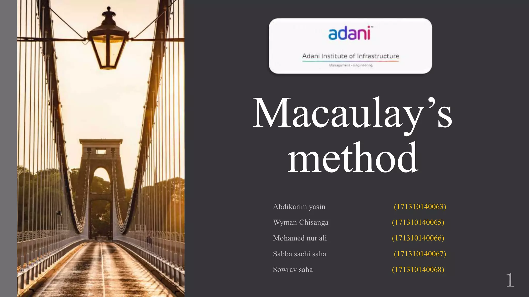 4) Apply boundary conditions to determine the constants, resulting in final equations to calculate slope and deflection at any section. This avoids deriving separate equations for each beam section as with traditional methods
