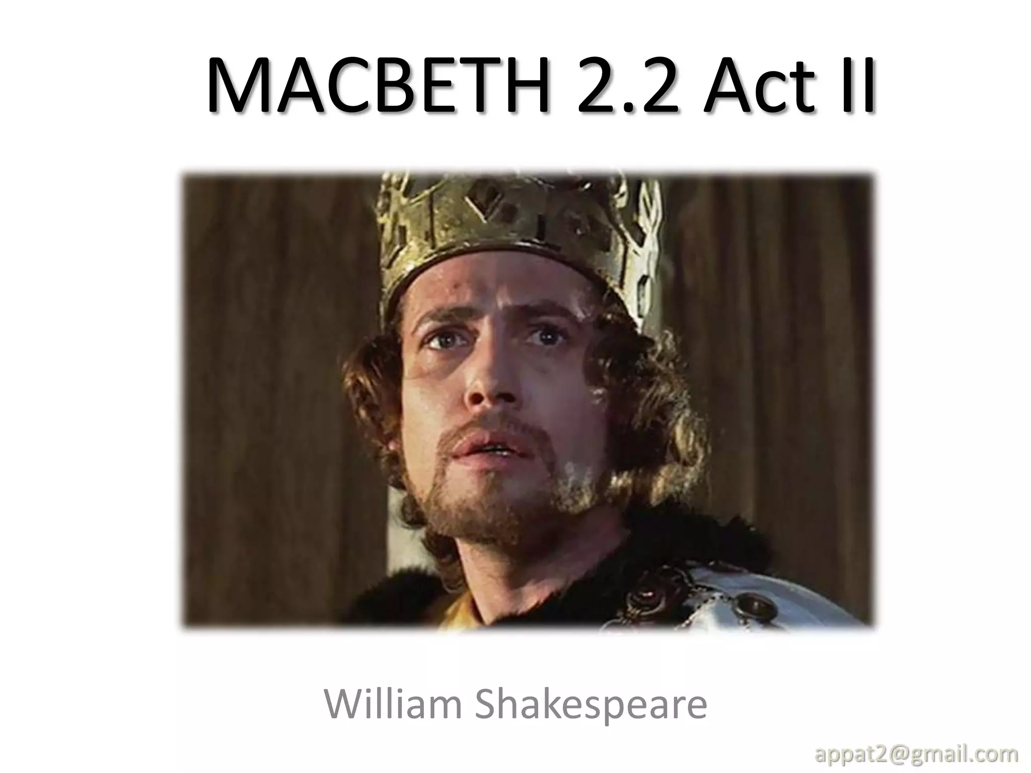 In Act II of Macbeth, Macbeth murders King Duncan while he sleeps, driven by supernatural visions and Lady Macbeth's manipulation. To cover up the crime, Lady Macbeth frames Duncan's guards, and when Duncan's sons flee, Macbeth seizes the throne. In Act III, fearing the prophecy that Banquo's descendants will inherit the throne, Macbeth has Banquo killed but is haunted by his ghost at a banquet, revealing his growing madness and insecurity.