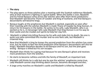 The play opens with three witches prophesying that Macbeth will become king of Scotland. Their prophecy comes true when Macbeth kills King Duncan and takes the throne. However, Macbeth grows increasingly paranoid as more of the witches' predictions come true, leading him to commit more murders to protect his power. Lady Macbeth goes mad with guilt and dies, while forces led by Macduff defeat Macbeth's army and kill Macbeth, fulfilling the remainder of the prophecies.