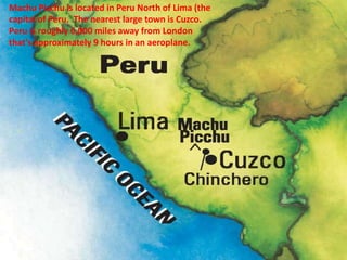 Machu Picchu is an Inca citadel set high in the Andes Mountains in Peru, near Cuzco. It is located over 8,000 feet above sea level and was built in the 15th century, but abandoned a century later at the time of the Spanish conquest of the Inca Empire. The ruins were rediscovered in 1911 by American historian Hiram Bingham. Today it is one of Peru's most popular tourist attractions, though visiting requires strenuous hiking at high altitude and tourism has caused environmental impacts to the surrounding area.