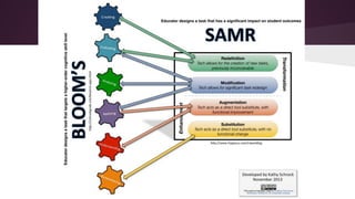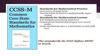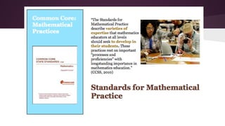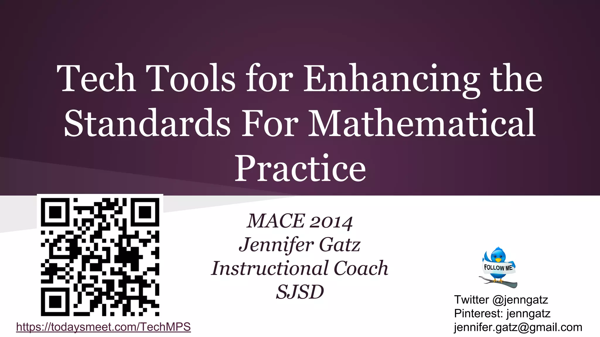 This document provides an overview of tech tools that can be used to enhance the Standards for Mathematical Practice. It discusses how tools like Kahoot, LiveBinder and illustrative mathematics websites can help students develop skills like making sense of problems, constructing arguments, modeling with math, and using tools strategically. While technology is not emphasized in math standards, tools are recommended as a way to connect, collaborate, communicate and create for deeper learning. Examples of apps are provided for each practice, and it is noted that the tools alone do not guarantee proficiency - the tasks and how students think must support the practices. Reflections emphasize having students explain concepts and learning how to learn over just explanations.