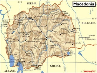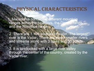 Macedonia contains two mountain ranges and over 1,100 water sources including its largest river, the Vadar. The country has a large central river valley and is landlocked. Most Macedonian traditions originate from Yugoslavia, such as arranged marriages within one's own religion and baking coins in New Year's cakes. The major ethnic groups and languages are Macedonian and Albanian, while the primary religions practiced are Macedonian Orthodox and Muslim.