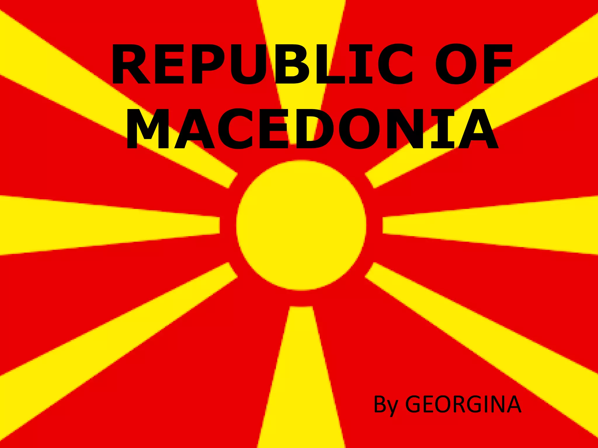 The Republic of Macedonia is a country in Southeast Europe located in the Balkan peninsula. It declared independence in 1991 after the breakup of Yugoslavia and its capital and largest city is Skopje. The majority of Macedonians speak Macedonian, a South Slavic language, as their first language. The national flag depicts a yellow sun on a red field and the majority of Macedonians belong to the Macedonian Orthodox Church. Macedonian culture is characterized by folk dances like the Kopačka and cultural events include music, poetry, and film festivals. Macedonian cuisine has Mediterranean and Middle Eastern influences and features local vegetables, dairy products, and dishes.