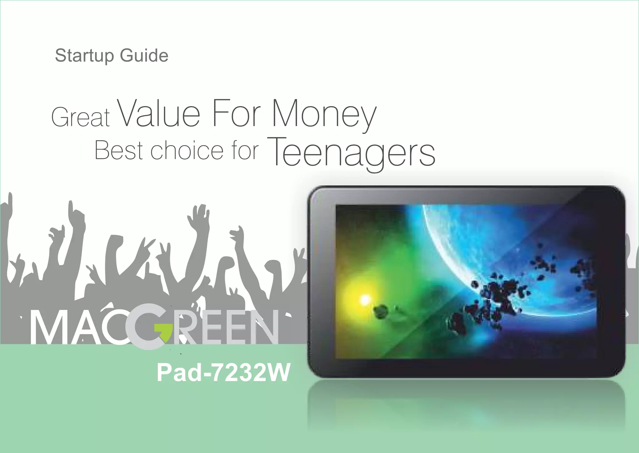 The document is a startup guide for the Macgreen Pad tablet, providing essential information for new users to quickly get started with the device. It includes details on package contents, features, touchscreen functionality, charging, inserting memory cards, internet connectivity, and using various applications. Users are advised to read the guide carefully and keep it for future reference.