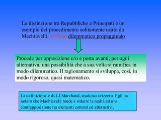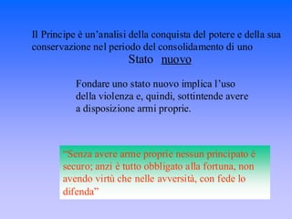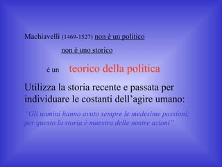 Machiavelli, teorico della politica, analizza la natura umana per sviluppare costanti comportamentali essenziali nella scienza politica. Sostiene che politica e morale sono ambiti distinti, enfatizzando che un buon politico deve perseguire il bene dello Stato utilizzando tutti i mezzi necessari. La fortuna, intesa sia come imprevedibilità sia come aspetto razionale, gioca un ruolo cruciale nel successo politico, specialmente nei principati.