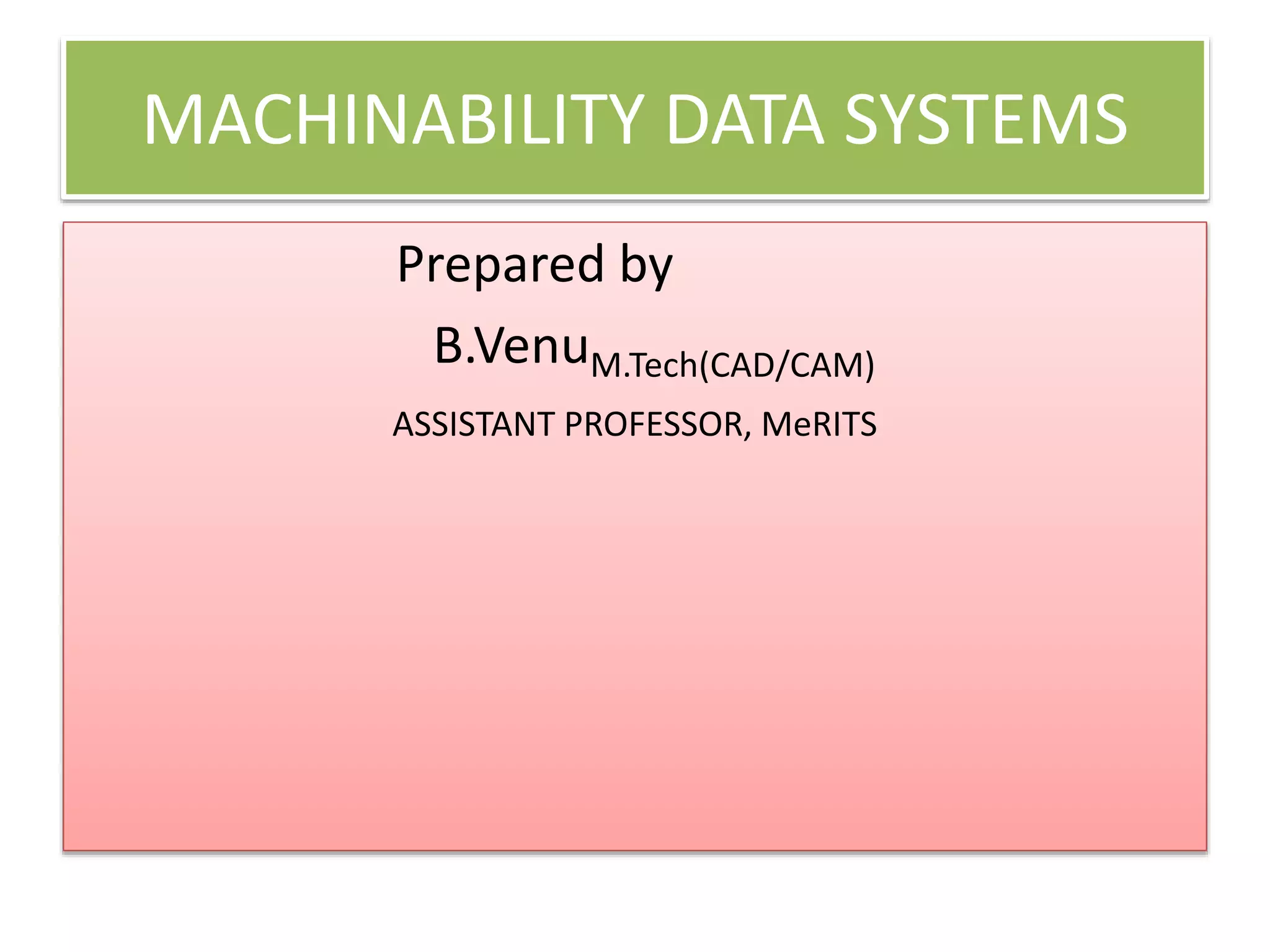 Machinability data systems aim to select the proper cutting speed and feed rate for a machining operation given characteristics of the operation such as the type of machining, machine tool, cutting tool, workpiece, and other parameters besides speed and feed. There are two main types of machinability data systems: database systems which store data from experiments and experience to provide recommendations, and mathematical model systems which go beyond simply retrieving data by attempting to predict optimal cutting conditions through mathematical models.