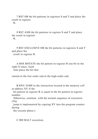 The document provides a list of machine code instructions along with their operands and descriptions, detailing operations like loading, storing, arithmetic, logical operations, and program control. It includes examples of translating English instructions into machine language and vice versa, as well as running a program using specified memory cell contents. Additionally, the document outlines basic CPU operations in computing and machine language contexts.