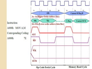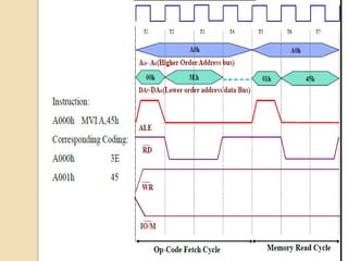 The document defines timing diagrams, machine cycles, and T-states. It then discusses the specific machine cycles of the 8085 microprocessor, including the opcode fetch cycle, memory read/write cycles, I/O read/write cycles, and interrupt acknowledge cycle. It provides examples of timing diagrams for various instructions like STA, INR, and discusses registers and instructions like STAX, MVI, LHLD.