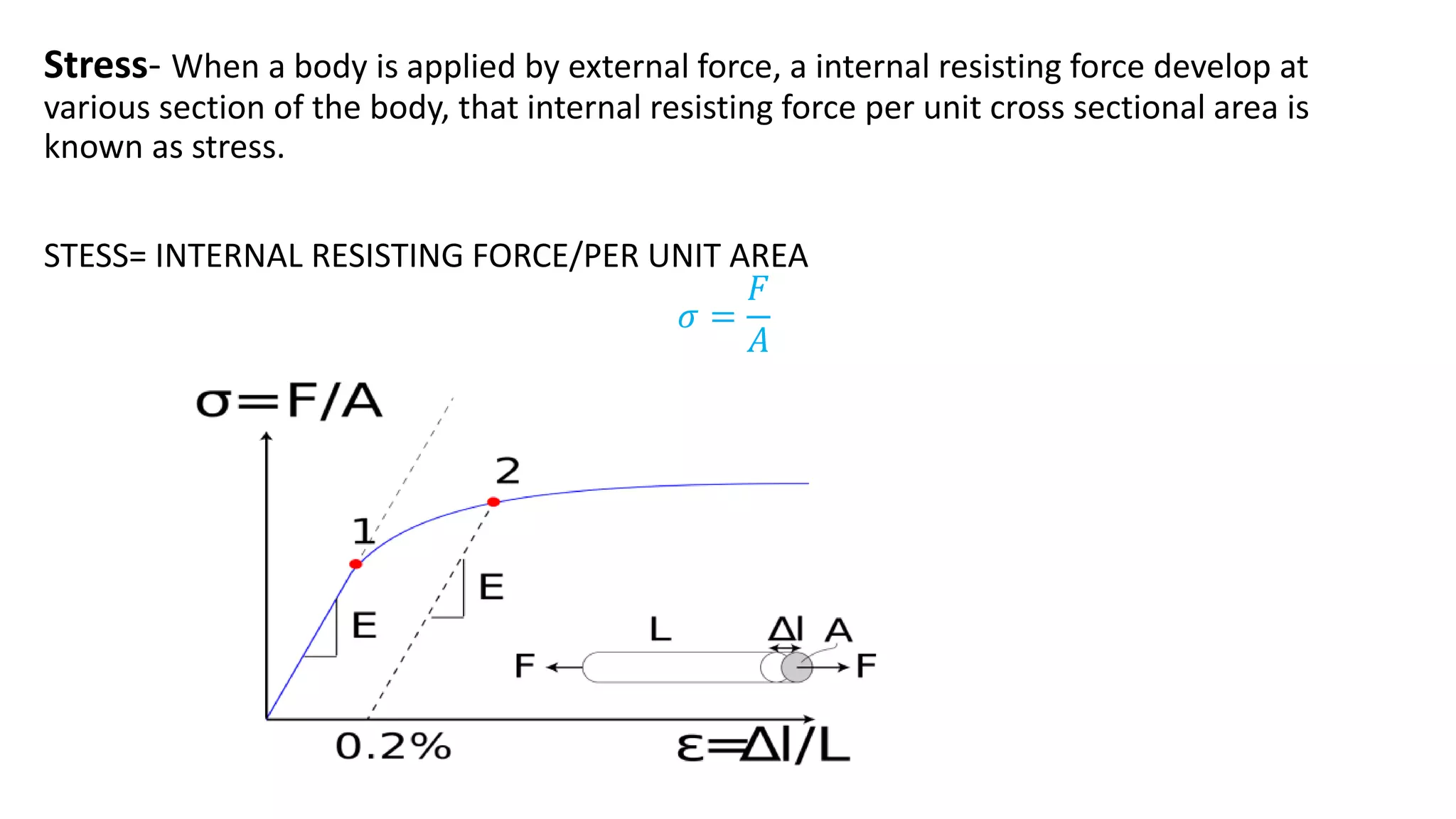 - Stress is defined as the internal resisting force per unit area when an external force is applied. Strain is the change in length per original length when a body experiences a force.