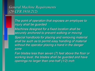 This document discusses machine guarding requirements and guidelines. It provides information on various types of machine guards, including fixed guards, interlocked guards, adjustable guards, and self-adjusting guards. It emphasizes that all hazards on machinery, including moving parts like belts, pulleys, gears and shafts, should be properly guarded. Employers must provide training to operators on machine hazards and safeguards. Standards require guards on abrasive wheels, and that work rests and tongue guards be used properly.