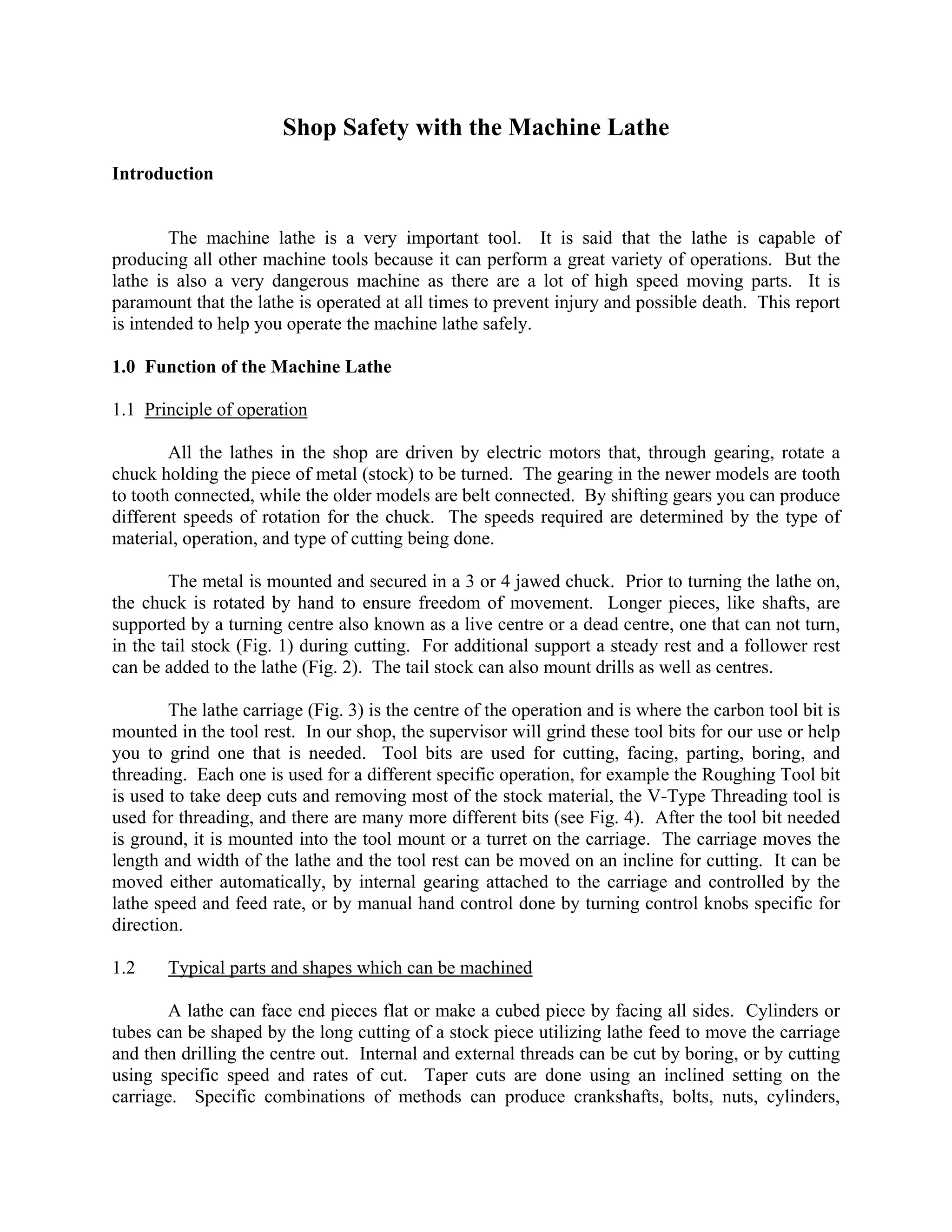The document provides safety guidelines for operating a machine lathe. It describes the basic functions and parts of the lathe, including how the metal stock is secured and rotated, and how different tool bits are used to cut various shapes. It emphasizes the importance of wearing proper protective equipment, securing long hair and loose clothing, and ensuring the lathe is properly set up before starting. Specific safety tips are provided for operating controls, handling cutting debris, and cleaning up when finished.
