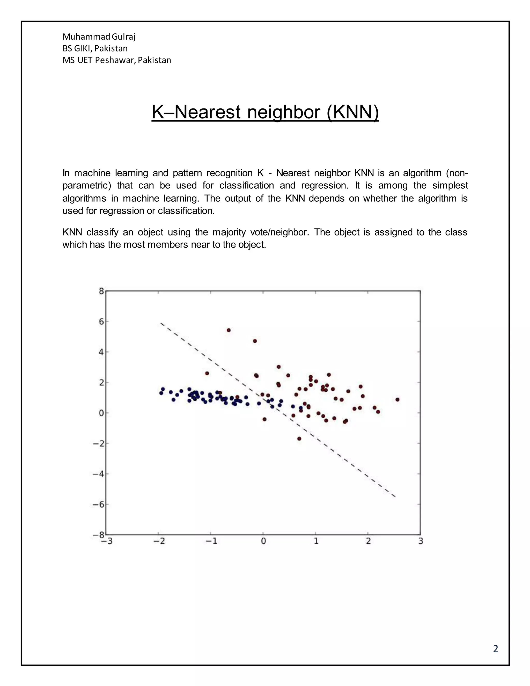 This document discusses several machine learning algorithms including K-nearest neighbors (KNN), Naive Bayes classification, and K-means clustering. KNN is described as a simple algorithm that classifies objects based on the majority class of its K nearest neighbors. Naive Bayes classification uses Bayes' theorem to update classification probabilities based on additional evidence or features. K-means clustering partitions observations into K clusters by assigning each observation to the nearest cluster mean and iteratively updating the cluster means. Examples and implementations of each algorithm are provided.