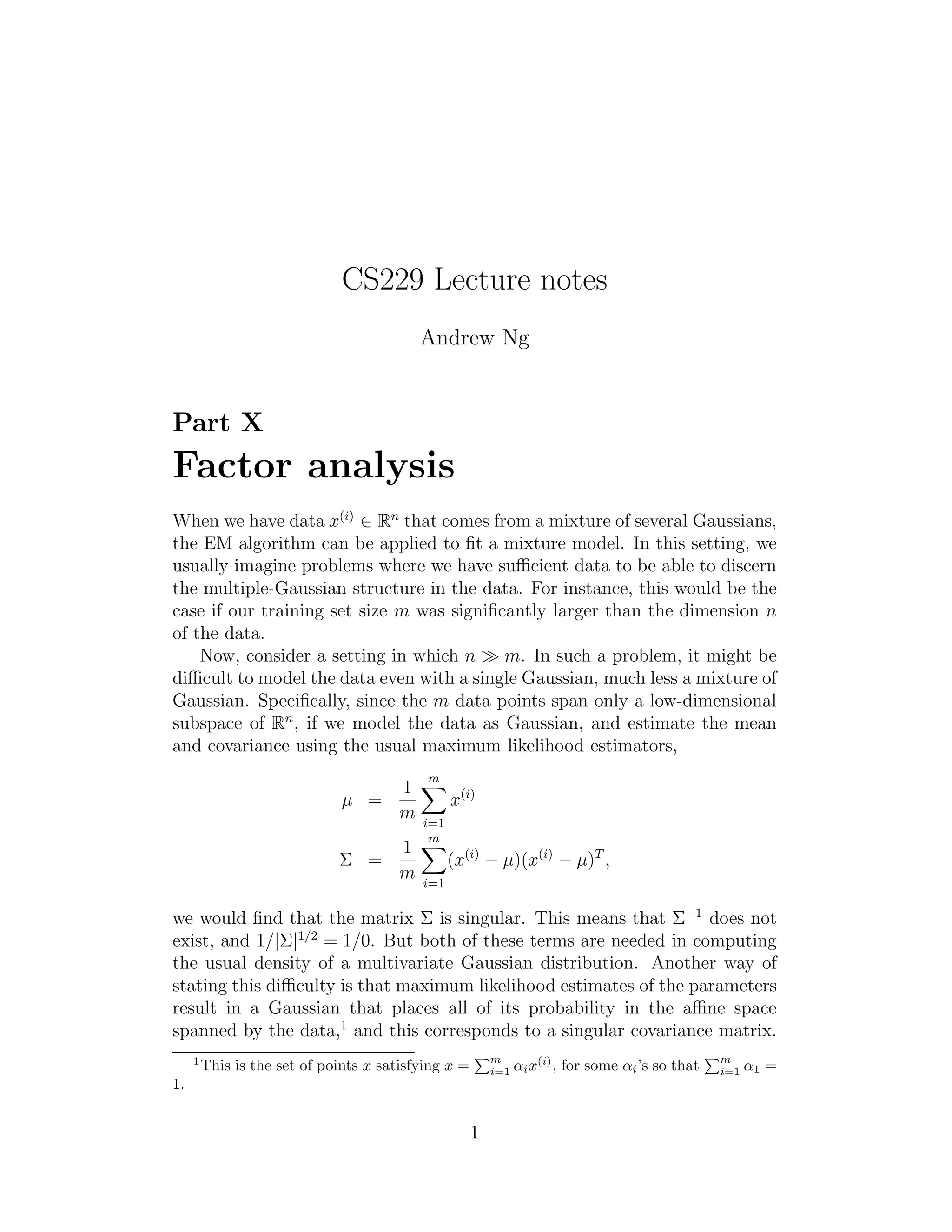 This document summarizes part of a lecture on factor analysis from an machine learning course. It introduces the factor analysis model, which posits that observed data is generated by an underlying latent variable that is mapped to the observed space with noise. It describes the factor analysis model mathematically as a joint Gaussian distribution between the latent and observed variables. It also derives the E-step and M-step updates for performing maximum likelihood estimation of the factor analysis model parameters using EM algorithm.