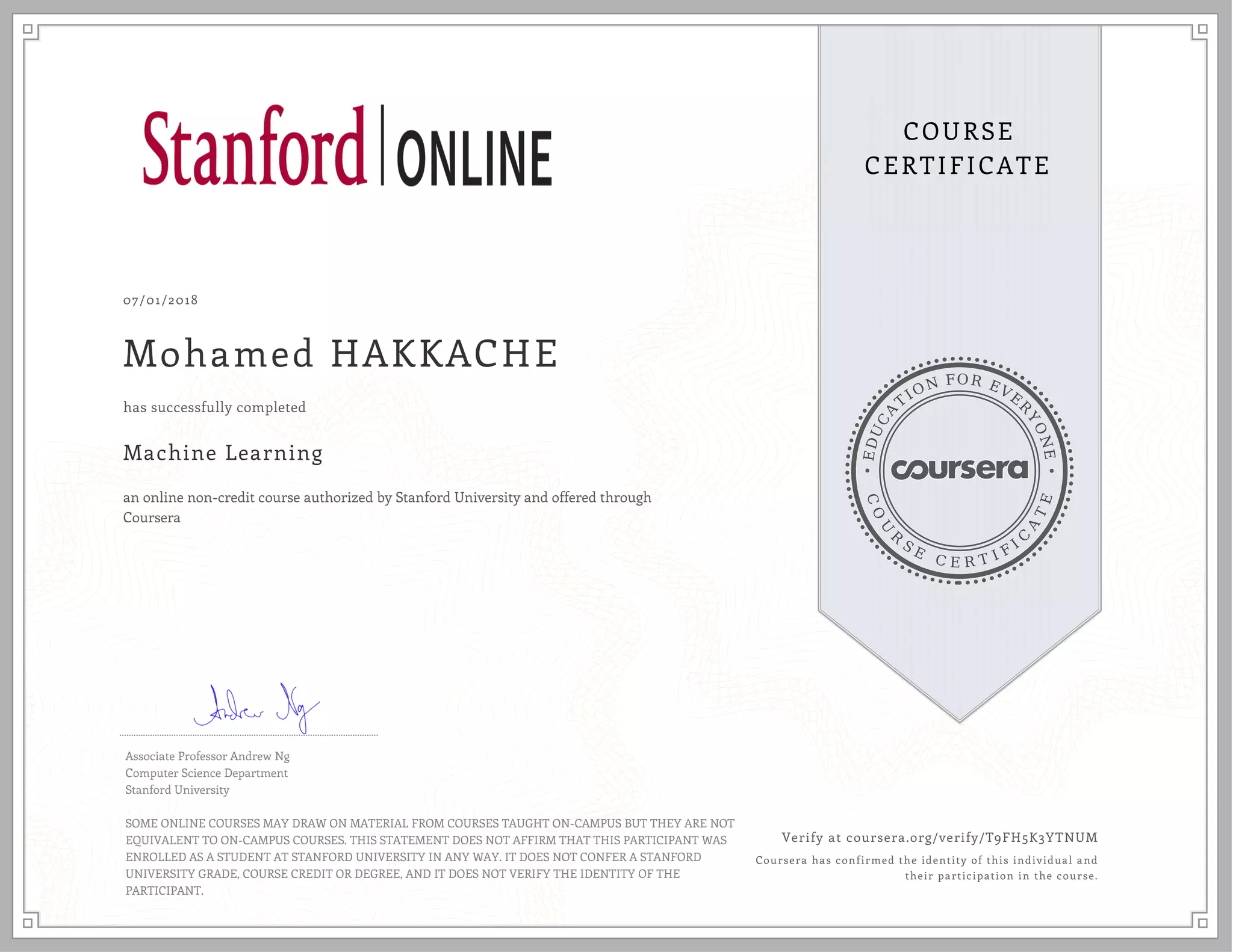 This document is a certificate from Coursera recognizing that Mohamed Hakkache successfully completed an online machine learning course offered through Coursera and authorized by Stanford University. The certificate notes that while the online course may cover similar material to campus courses, it does not confer the same academic credits and does not represent enrollment as a Stanford student. Coursera has verified Mohamed Hakkache's identity and participation in the course.