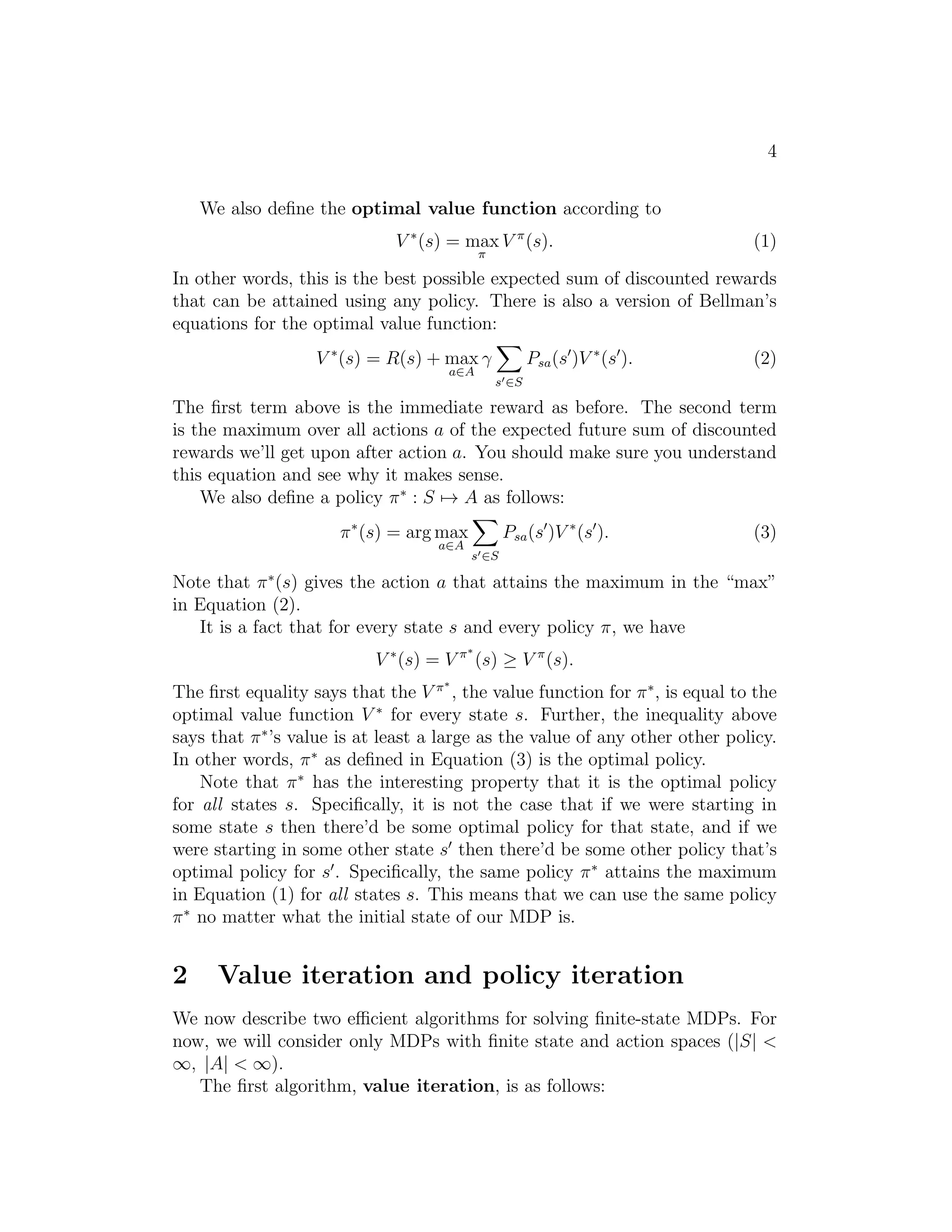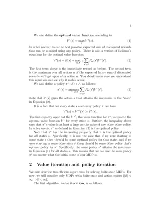 This document summarizes key concepts from Andrew Ng's lecture notes on reinforcement learning and control. It introduces reinforcement learning as a framework where learning agents receive rewards to indicate good or bad behavior, rather than explicit labels as in supervised learning. Markov decision processes (MDPs) provide a formalism for modeling reinforcement learning problems. The document describes value iteration and policy iteration algorithms for solving finite state MDPs to find the optimal value function and policy. It also discusses estimating transition probabilities and rewards from experience to learn a model of an unknown MDP.