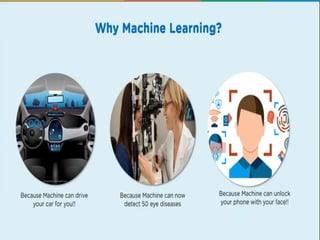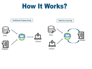 The document provides an introduction to machine learning, covering its definition, types (supervised, unsupervised, and reinforcement learning), and applications. It emphasizes that machine learning enables computers to learn from data and improve performance without explicit programming. Additionally, it outlines the machine learning life cycle and various real-world applications such as virtual assistants, marketing, and computer vision.