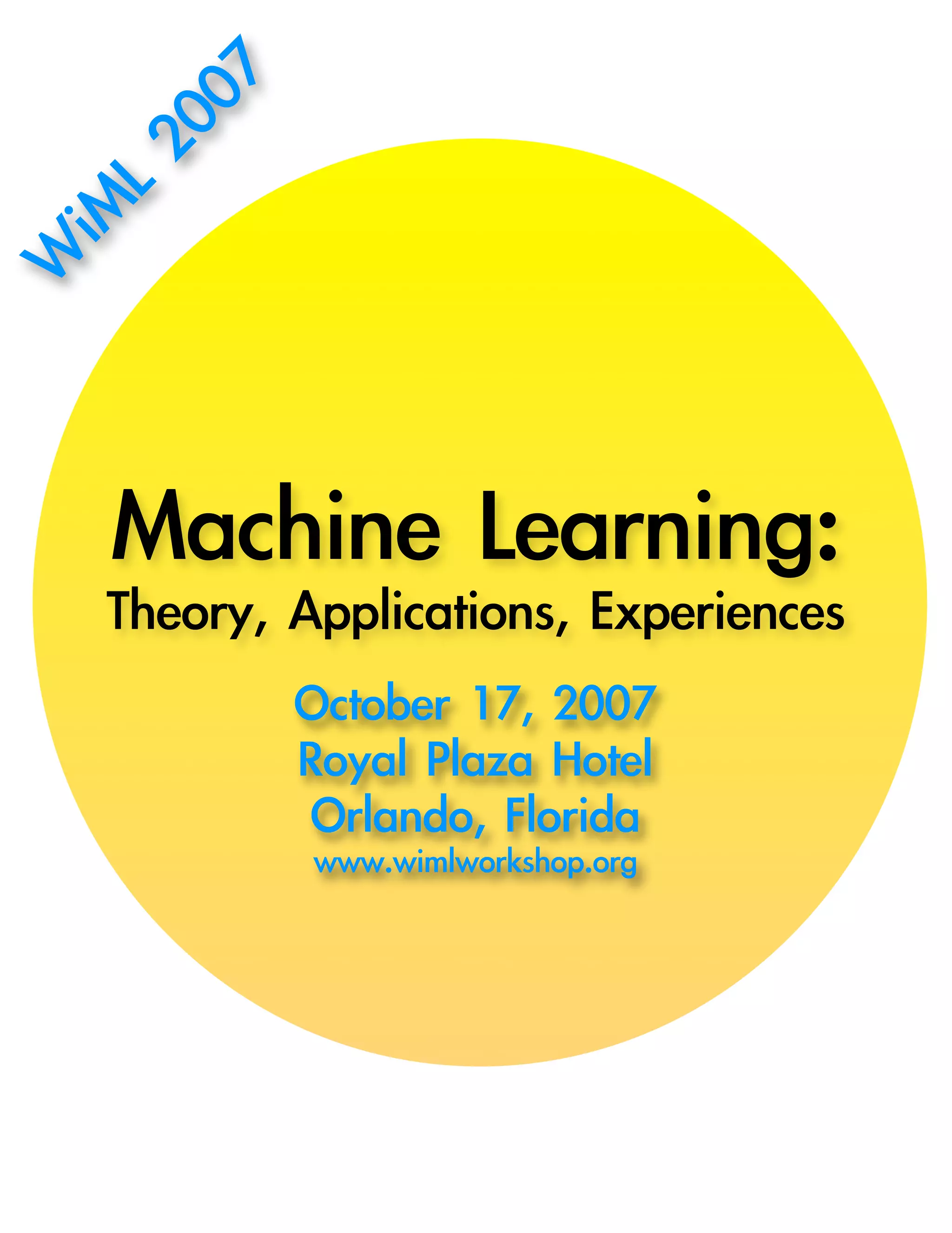The document provides the schedule for a machine learning conference. It includes the times for registration, invited talks on topics like machine learning in space and applying machine learning to real-world problems, contributed talks on research topics, coffee breaks, lunch, and a poster session. The day concludes with a panel discussion and concluding remarks.