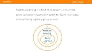The document discusses machine learning and artificial intelligence, highlighting its ability to learn from data without explicit programming. It provides a brief history of AI, technical insights into deep learning, and applications in various fields, especially healthcare. Elsevier's gender distribution shows a higher representation of women in tech roles compared to industry averages.
