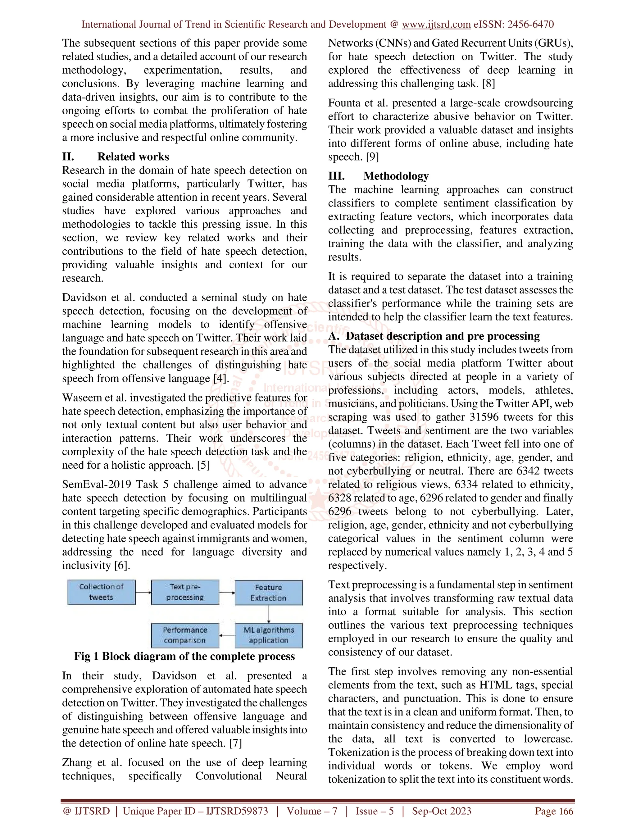 This document presents a study on the use of machine learning models for automatic hate speech detection on Twitter, addressing the growing concern of hate speech on social media. The authors developed a diverse dataset and employed a hybrid methodology combining natural language processing techniques with machine learning algorithms, achieving high accuracy with models such as random forest and support vector machines. The findings contribute to the effort of creating safer and more inclusive online environments while highlighting the challenges of bias and fairness in automated moderation systems.