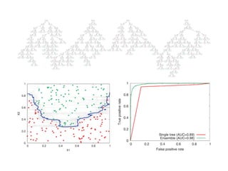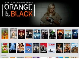 The document discusses machine learning applications at Netflix, focusing on the recommendation system that personalizes content for users based on their preferences. It highlights the scale of Netflix's data, which includes over 44 million members and logging of 100 billion events daily, and details various machine learning techniques used for accurate predictions and improved recommendations. Additionally, the document outlines the architecture of the machine learning platform that supports this massive scale of data processing and model training.