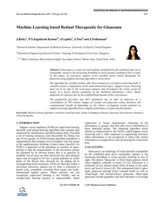 This document discusses a novel machine learning approach using support vector machines (SVM) to develop a retinal therapeutic for glaucoma, achieving a 94% success rate in testing on images of both healthy and glaucomatous retinas. Glaucoma is characterized by optic nerve damage leading to vision loss and is classified into various types, including open-angle and closed-angle glaucoma. The paper also explains the clustering algorithm utilized in the SVM method to improve classification and analysis of glaucoma-related data.