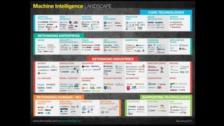 The document discusses the evolution of machine learning, highlighting its definitions, challenges, and recent breakthroughs such as DeepMind's AlphaGo and various applications in industries including healthcare and finance. It outlines the major challenges in implementing machine learning, particularly in data preparation and integration, while envisioning intelligent machines that simplify analytics processes. Furthermore, it touches upon scalability issues and emerging technologies aimed at enhancing data analysis and user interaction with intelligent systems.