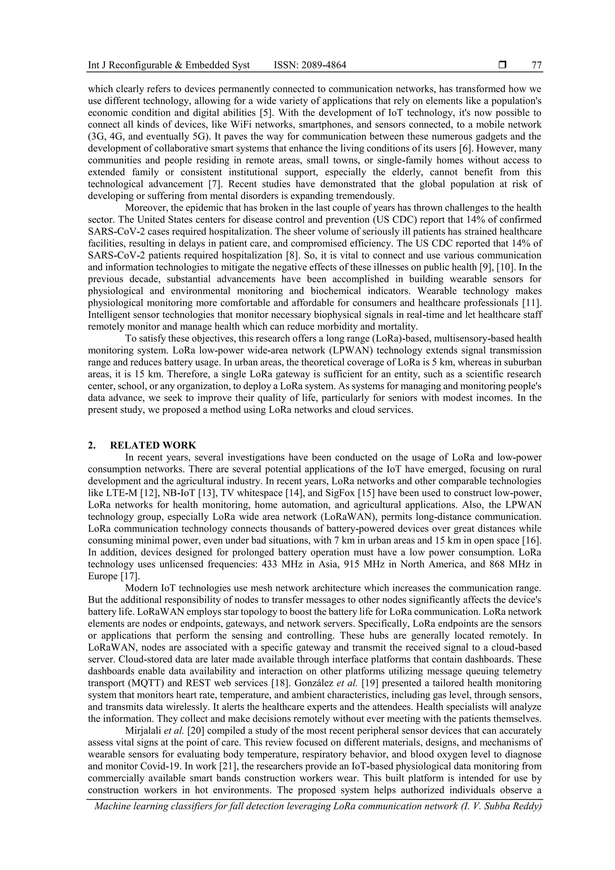 The study proposes a low-power, multi-node health monitoring system utilizing LoRa technology to track physiological data, including heart rate and temperature, from outdoor sensor nodes to an indoor master node, enabling remote monitoring. Machine learning classifiers, particularly decision trees, are applied for fall detection, achieving a high accuracy of 0.99864, which aids in identifying high-risk individuals. This innovative system aims to enhance health monitoring, particularly for the elderly, leveraging IoT advancements and cloud services.