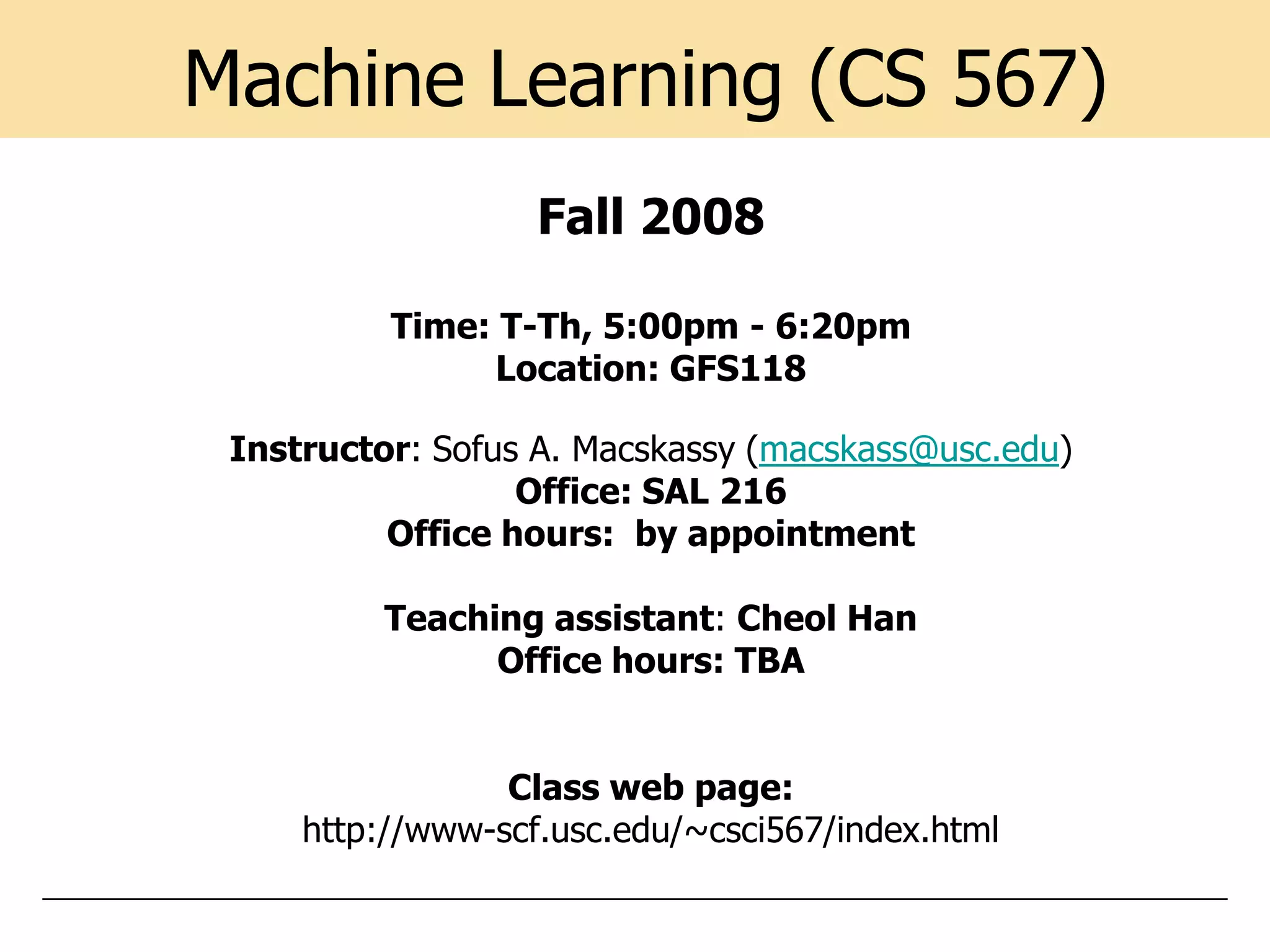 This document provides information about the Machine Learning (CS 567) course offered at USC in Fall 2008. The course will be taught on Tuesdays and Thursdays from 5-6:20pm in location GFS118. The instructor is Sofus Macskassy and the teaching assistant is Cheol Han. The course will introduce core machine learning techniques and prepare students to use ML tools and contribute to the field. Evaluation will be based on quizzes, homework, exams, and a group project.