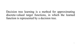 The document provides an overview of decision tree learning, which is a method for classifying instances based on discrete attributes represented in a tree structure. It explains the ID3 algorithm, its process for selecting attributes based on information gain, and addresses practical concerns such as overfitting. The discussion also highlights the inductive biases of decision tree learning and the importance of avoiding overfitting to ensure better generalization of the learned model.