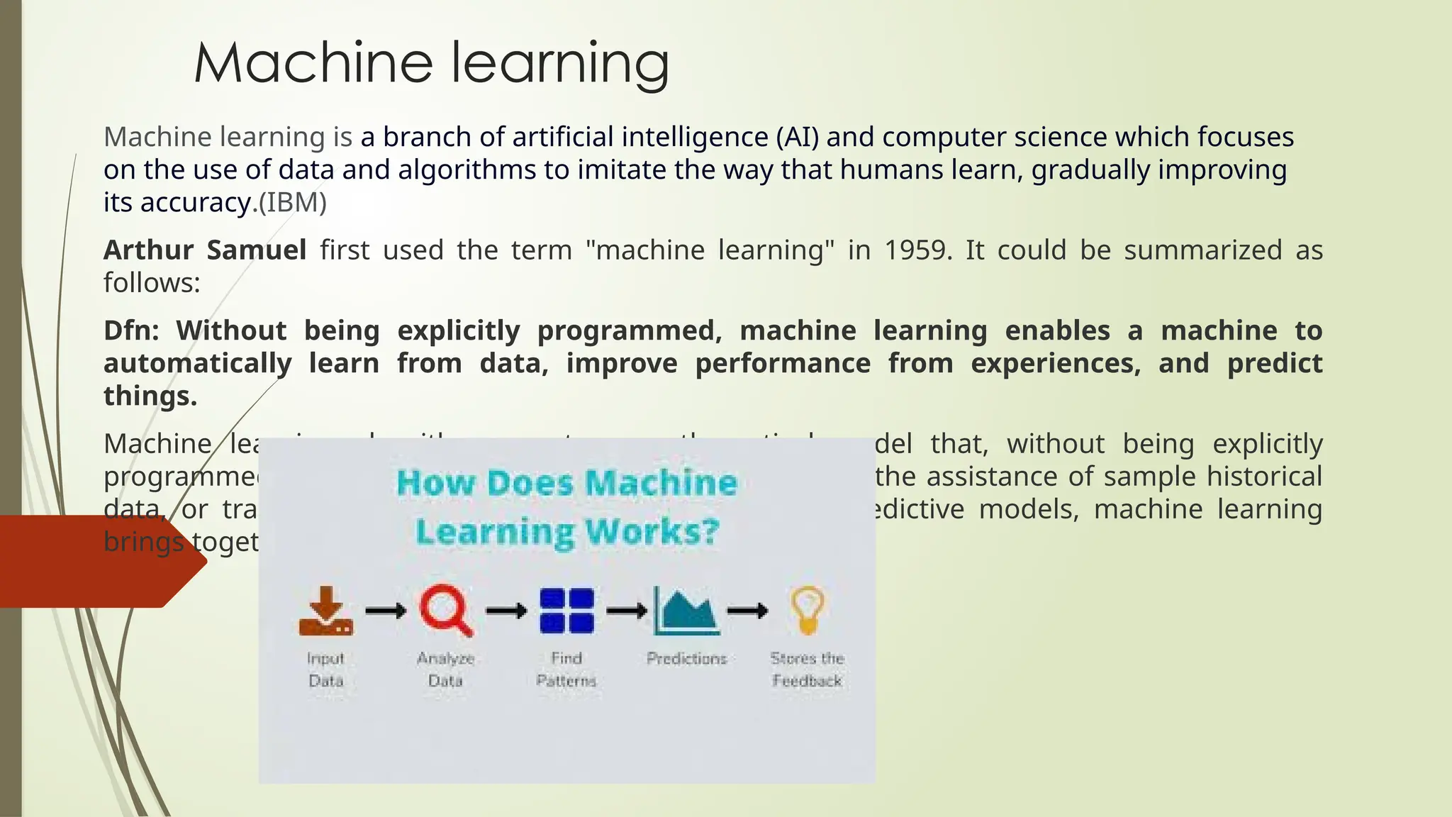 Arthur Samuel first used the term "machine learning" in 1959. It could be summarized as