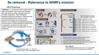 This document summarizes a presentation on developing an electrochemical system for selenium removal from water. The project aims to apply machine learning and automated synthesis techniques to accelerate materials development timelines. Initial calculations have reproduced experimental trends for nitrate reduction and screened candidate materials from databases. Procedures have also been established for electrode preparation, testing, and using robots to synthesize predicted candidates. While still early, progress has been made on computational screening, mitigating competing reactions, and testing baseline cathode materials for selenium removal performance and energy efficiency. The remainder of the first project year will focus on refining methods before demonstrating a commercially viable selenium removal system in years two and three.