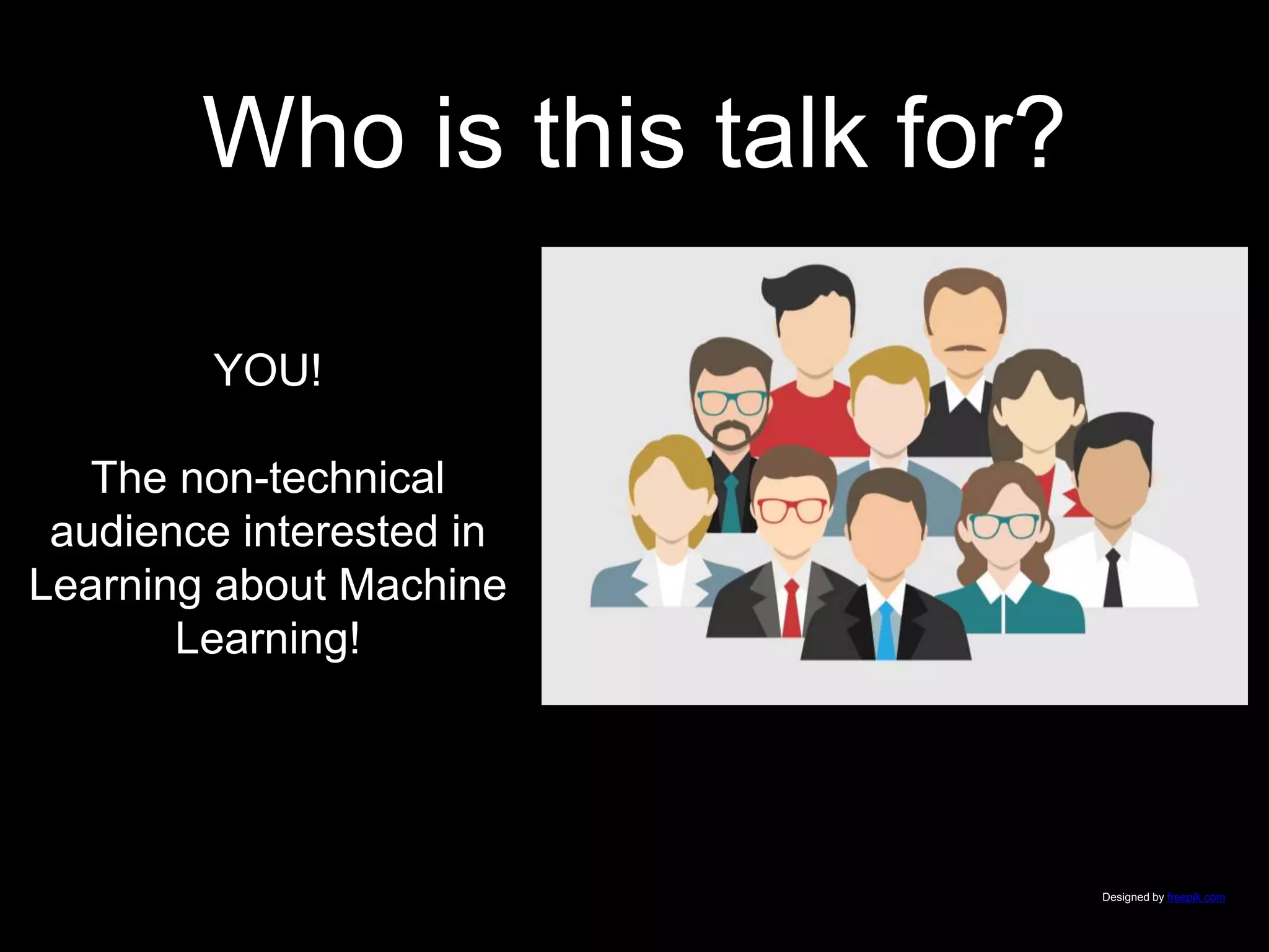The document provides an overview of machine learning tailored for a non-technical audience, explaining its significance and applications, particularly in sentiment analysis. It highlights the evolution of machine learning, challenges in teaching computers to understand language nuances, and the metrics used to evaluate AI performance. The speaker, Slater Victoroff, shares insights into the complexity of capturing sentiment and the importance of understanding data in training machine learning models.