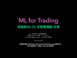 1. The document discusses using machine learning and deep learning techniques for trading, including classification, regression, clustering, and time series modeling with RNNs.