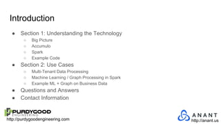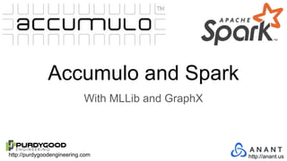 The document provides an overview of Accumulo and Spark technologies, detailing their key features, such as Accumulo's scalable key/value storage with cell-level security and Spark's general-purpose compute capabilities for batch and streaming data processing. It discusses specific use cases, including multi-tenant data processing and applications in machine learning and graph processing. Additionally, the document includes example code snippets and contact information for further inquiries.