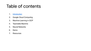 This document discusses machine learning topics including Google Cloud Platform, Teachable Machine, and neural networks. It provides an introduction to machine learning in education and how tools like Teachable Machine allow users to build machine learning models within seconds by training on their own data to classify images, sound, and more. The document aims to demonstrate machine learning applications that can help address social, humanitarian, and education challenges by transforming data into real value through these techniques.