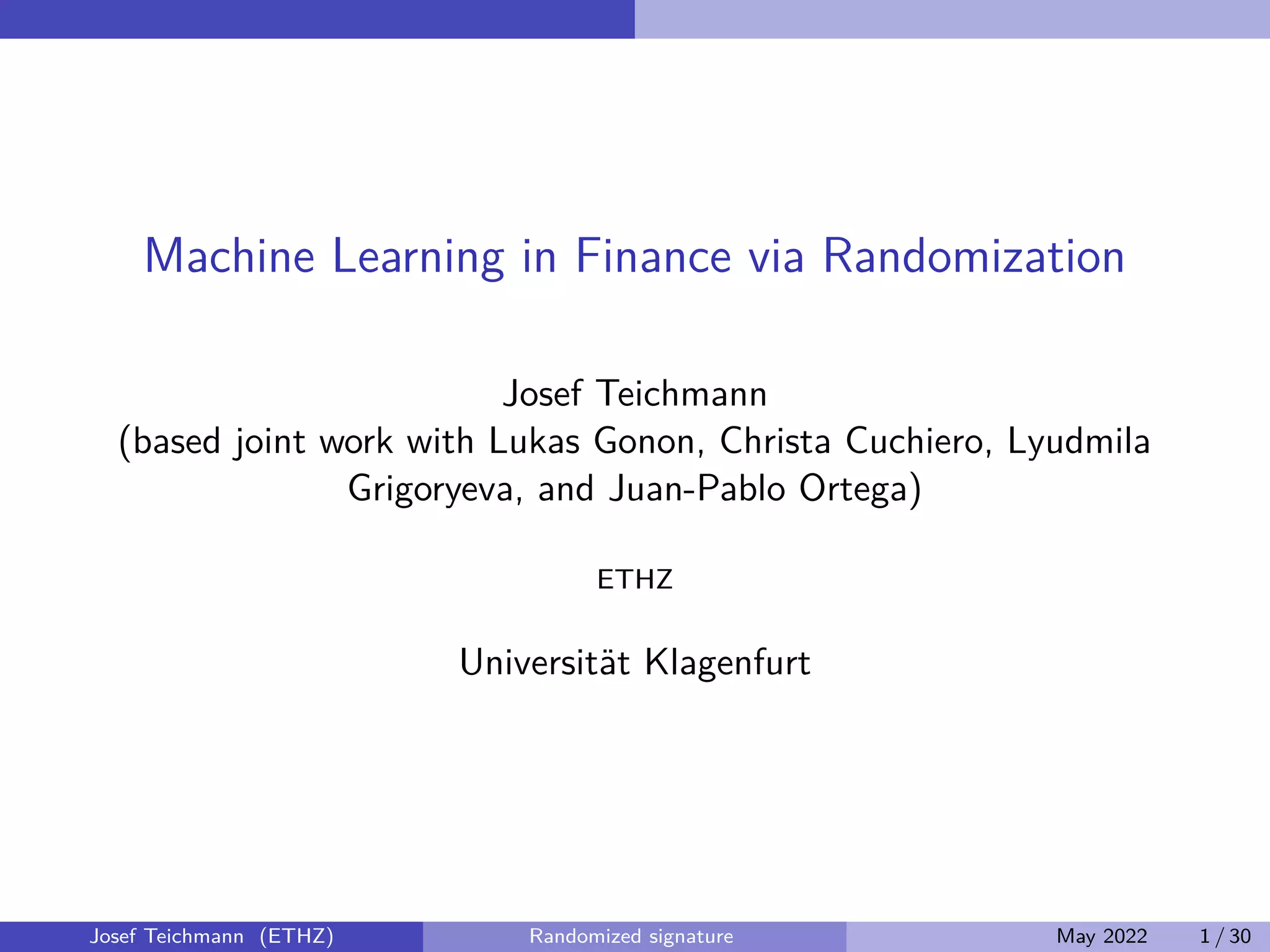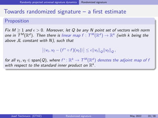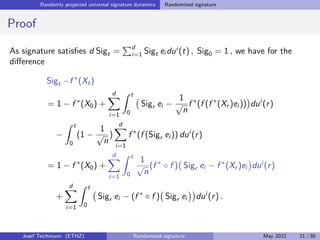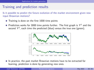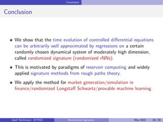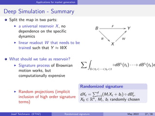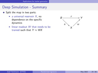 The document discusses using randomized recurrent neural networks and signature-based methods for machine learning in finance. It proposes splitting the input-output map of a dynamical system into a "reservoir" part and a linear "readout" part. The signature of the input signal provides a natural candidate for the reservoir, as it is point-separating and linear functions on the signature can approximate continuous functionals via the universal approximation theorem. The goal of the talk is to prove how dynamical systems can be approximated using randomized recurrent networks, with precise convergence rates, and to view randomized deep networks through this lens.