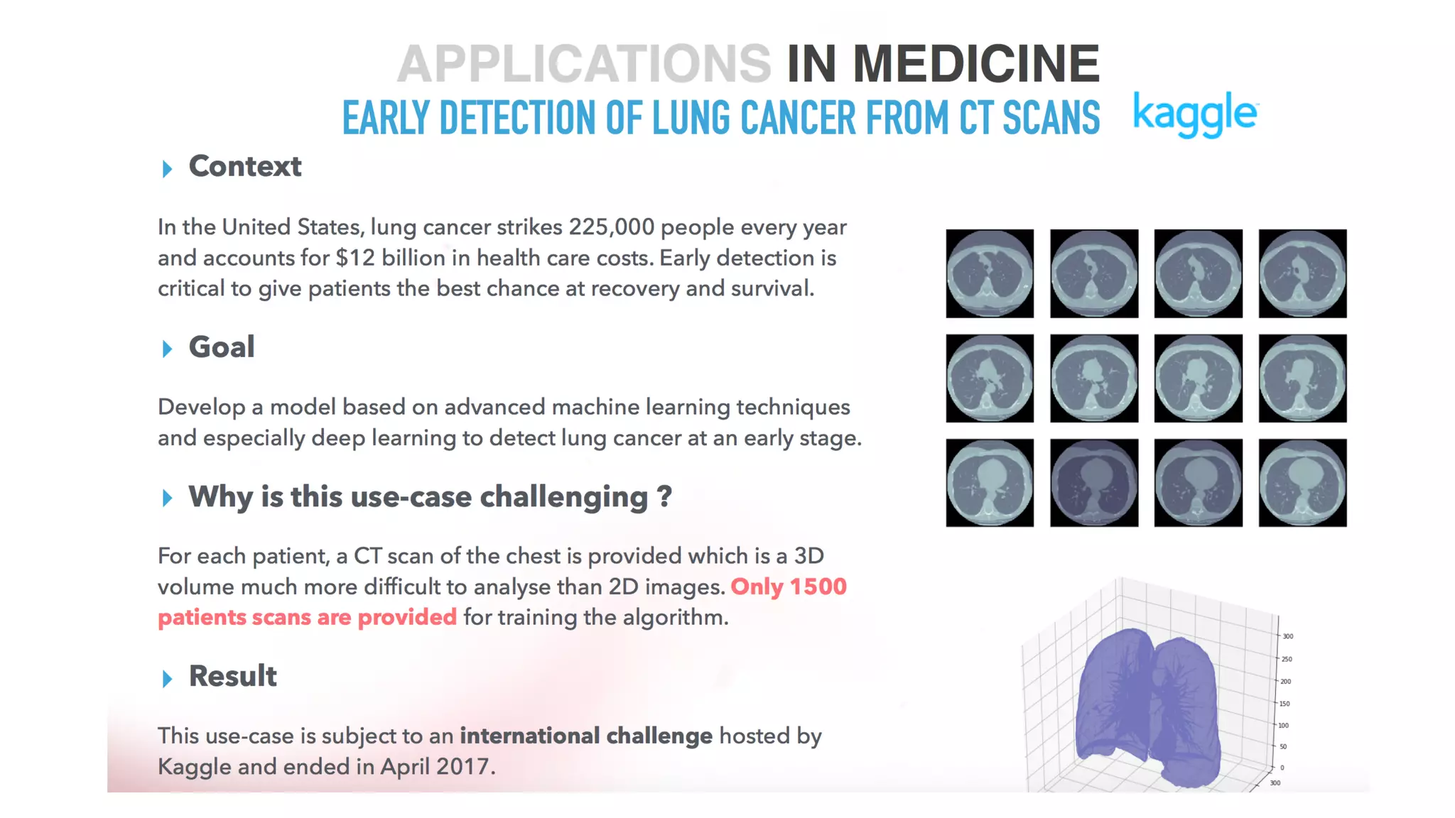 The document discusses machine learning in healthcare and life sciences. It provides an overview of machine learning techniques like classification, regression, and clustering. It then discusses IBM's Watson Data Platform and Data Science Experience for developing and deploying machine learning models at scale. The document presents a case study on using deep learning for lung cancer detection from medical images. It concludes with recommendations for applying machine learning including the importance of data and shortening development cycles.