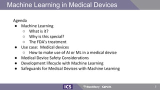The document discusses machine learning in medical devices. It describes how the FDA regulates machine learning as a medical device and proposes a framework for modifications to AI/ML models. The framework allows manufacturers to make pre-approved changes if they follow a predetermined change control plan or submit changes through an algorithm change protocol, software pre-specifications, and total product lifecycle approach. The document also discusses developing medical devices with machine learning and important safety considerations.