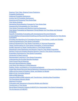 The document provides an overview of acquiring and processing time series data. It discusses analyzing energy consumption data from households to identify patterns and make predictions. Key steps include exploring and cleaning the data to handle issues like missing values, extracting relevant features, structuring the data for analysis in pandas, and techniques for handling missing data like imputation and converting between data formats. The goal is to efficiently analyze dynamic trends and relationships in the time series data.