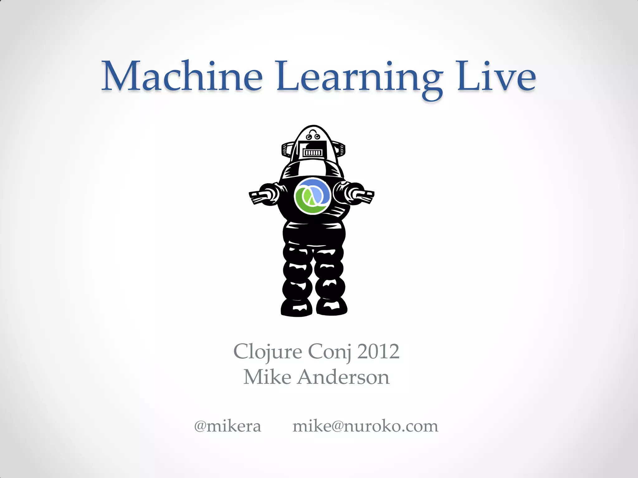 This document summarizes a presentation about machine learning. It begins with a definition of machine learning as giving computers the ability to learn without being explicitly programmed. It then provides examples of tasks that machine learning can perform, such as spam filtering and stock market prediction. The document notes that machine learning works to some degree but not perfectly. It introduces a company called Nuroko that is building a machine learning toolkit with certain desirable properties such as being general purpose, powerful, scalable, real-time, and pragmatic. The document explains why the company chose Clojure as its programming language and provides an overview of some key machine learning concepts and abstractions like vectors, coders, tasks, modules, and algorithms. It concludes