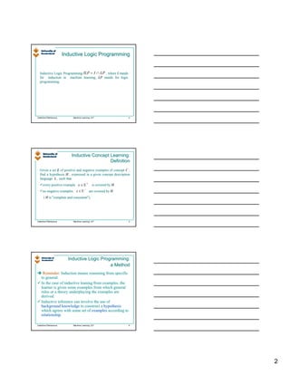 The document discusses inductive logic programming (ILP), which uses inductive learning techniques to learn logic programs from examples and background knowledge expressed in first-order logic. ILP aims to learn a target predicate by defining it in terms of known predicates from background knowledge. The FOIL algorithm is described, which searches for a hypothesis that covers all positive examples while avoiding negative examples by adding literals to rules to maximize information gain. ILP is useful because it can automatically infer logic programs from examples in the same way logic programming languages like Prolog represent programs as Horn clauses.