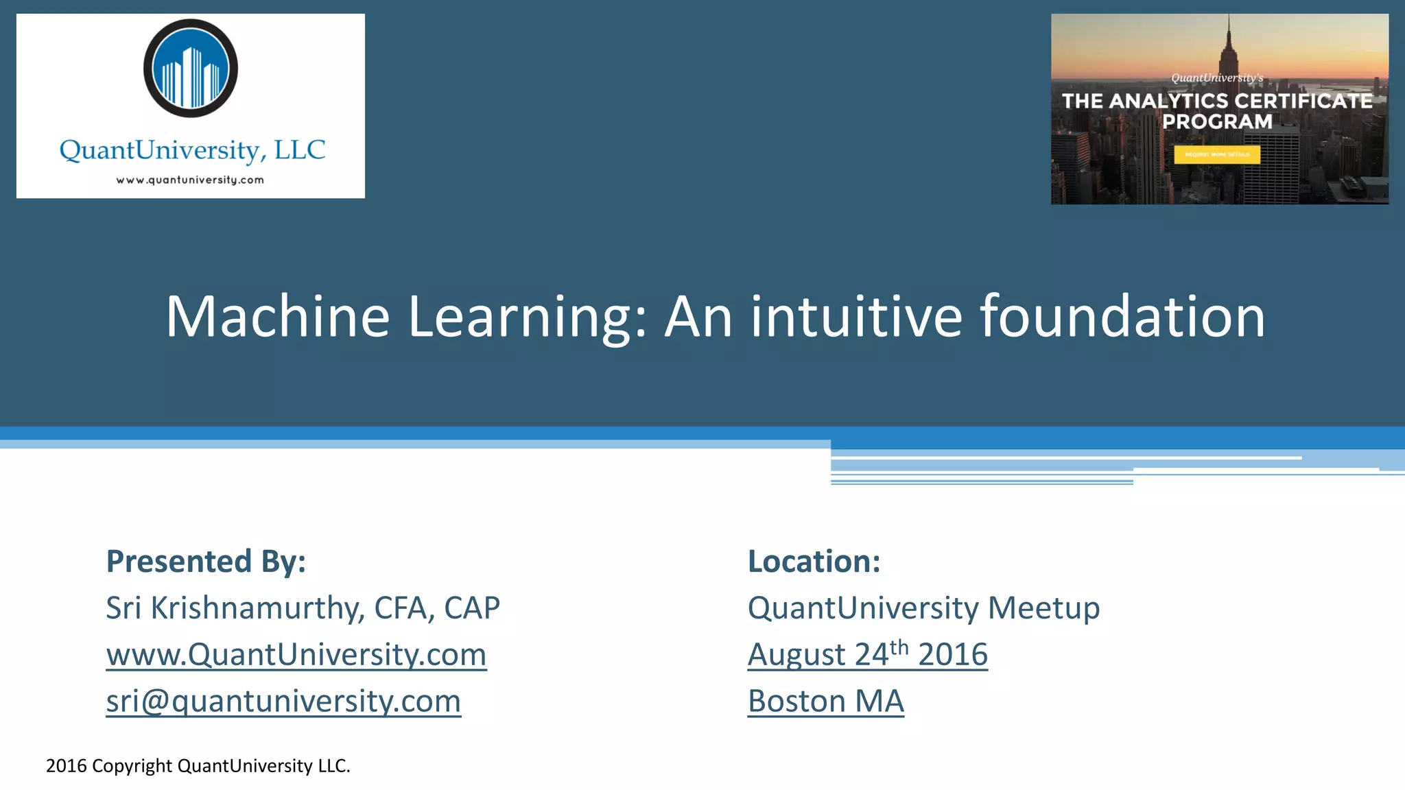 The document outlines a presentation by Sri Krishnamurthy at a QuantUniversity meetup in Boston on machine learning basics, focusing on analytics education and upcoming training programs. It covers essential topics such as data types, descriptive and predictive analytics, machine learning algorithms, and evaluation methods. Additionally, it promotes various workshops and courses related to analytics, starting in September 2016.