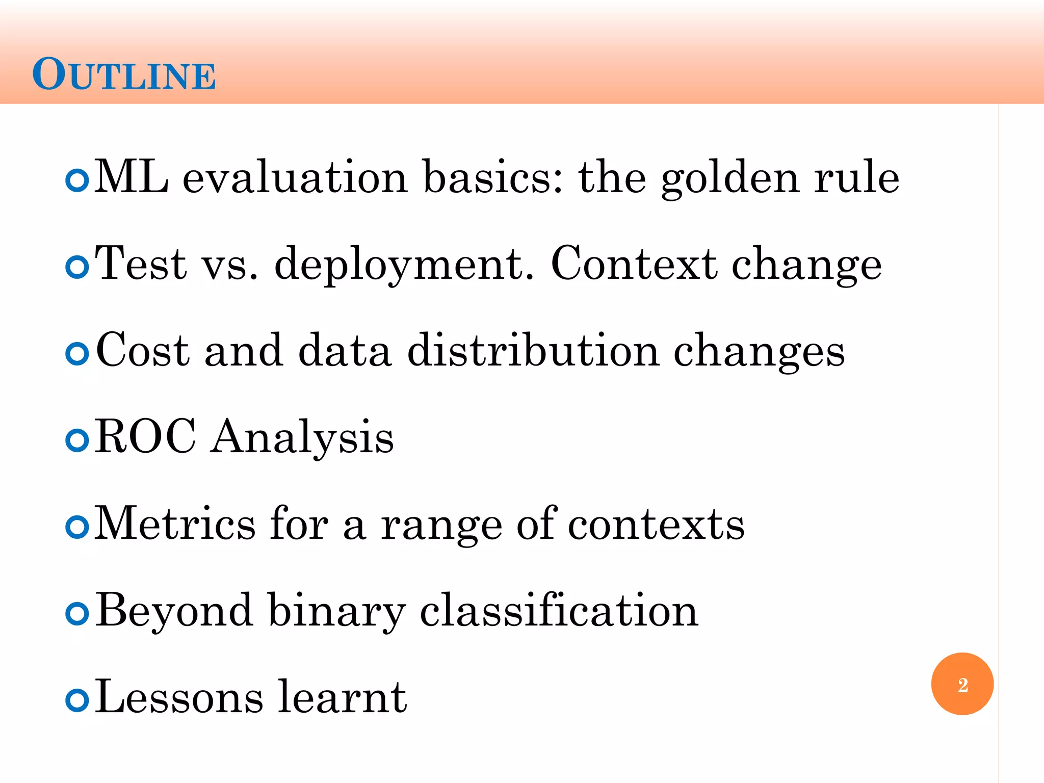 The document discusses machine learning performance evaluation, emphasizing the importance of context and proper measurement metrics for model effectiveness during deployment. It outlines key principles such as avoiding overstatement of model performance due to overfitting, the necessity of considering context changes, and using ROC analysis to assess classifier effectiveness across different conditions. Additionally, it highlights the significance of soft classifiers and the need for cost-sensitive evaluation in complex scenarios, including multiclass and regression problems.