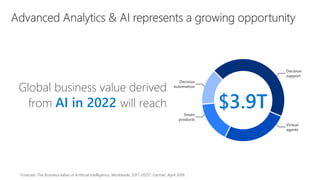 The document discusses how global business value derived from artificial intelligence (AI) will reach $3.9 trillion in 2022. It notes that AI will generate business value through decision support, virtual agents, decision automation, smart products, and other areas.