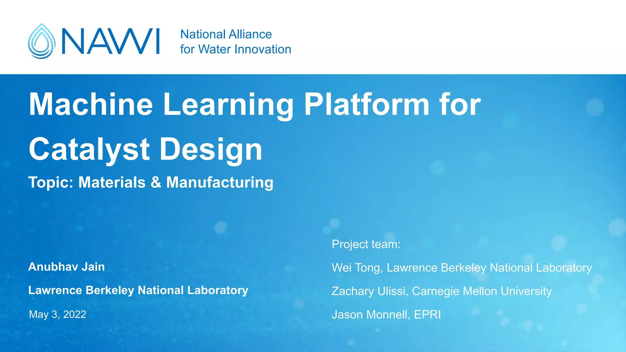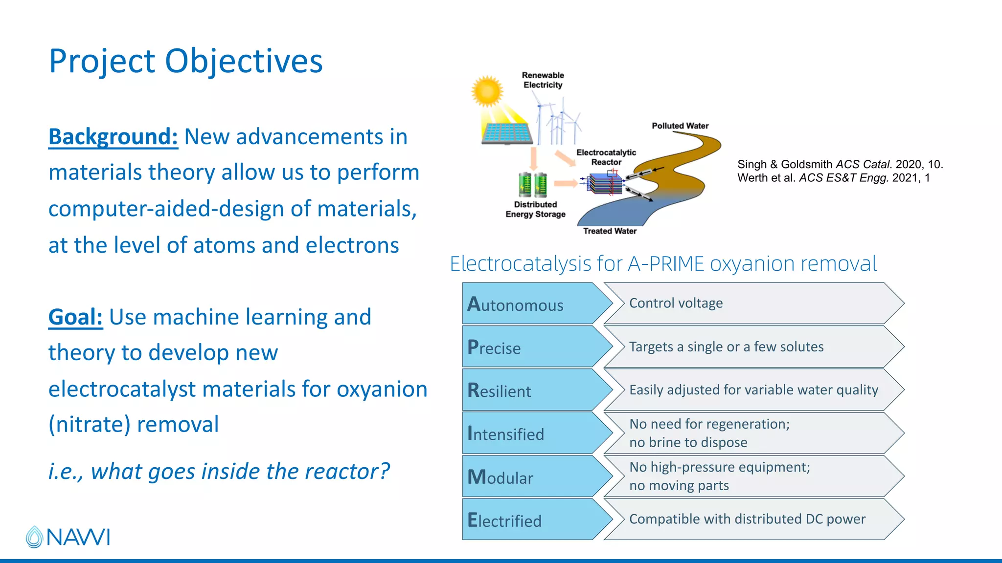This project aims to develop new electrocatalyst materials for nitrate removal from water using machine learning and computational screening. The team performed calculations on over 1,000 potential compositions to identify promising catalysts with low costs. Experimental synthesis of candidates such as ZnNi and Zn3Co was attempted but it is unclear if the desired alloys were produced. The screening approach is now being applied to identify materials for selenium removal. If successful, low-cost catalysts could be developed to reduce the costs of electrocatalytic water treatment.