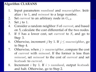 This document discusses the implementation of the CLARANS K-medoid clustering algorithm in Java. It also explores using the Torch machine learning library and Torch3Vision for image processing tasks like face detection. Different distance functions for clustering algorithms are analyzed and how they relate to spatial versus spectral patterns in images. The document presents results of clustering a sample image using K-medoid while varying the preference for spatial or spectral patterns.