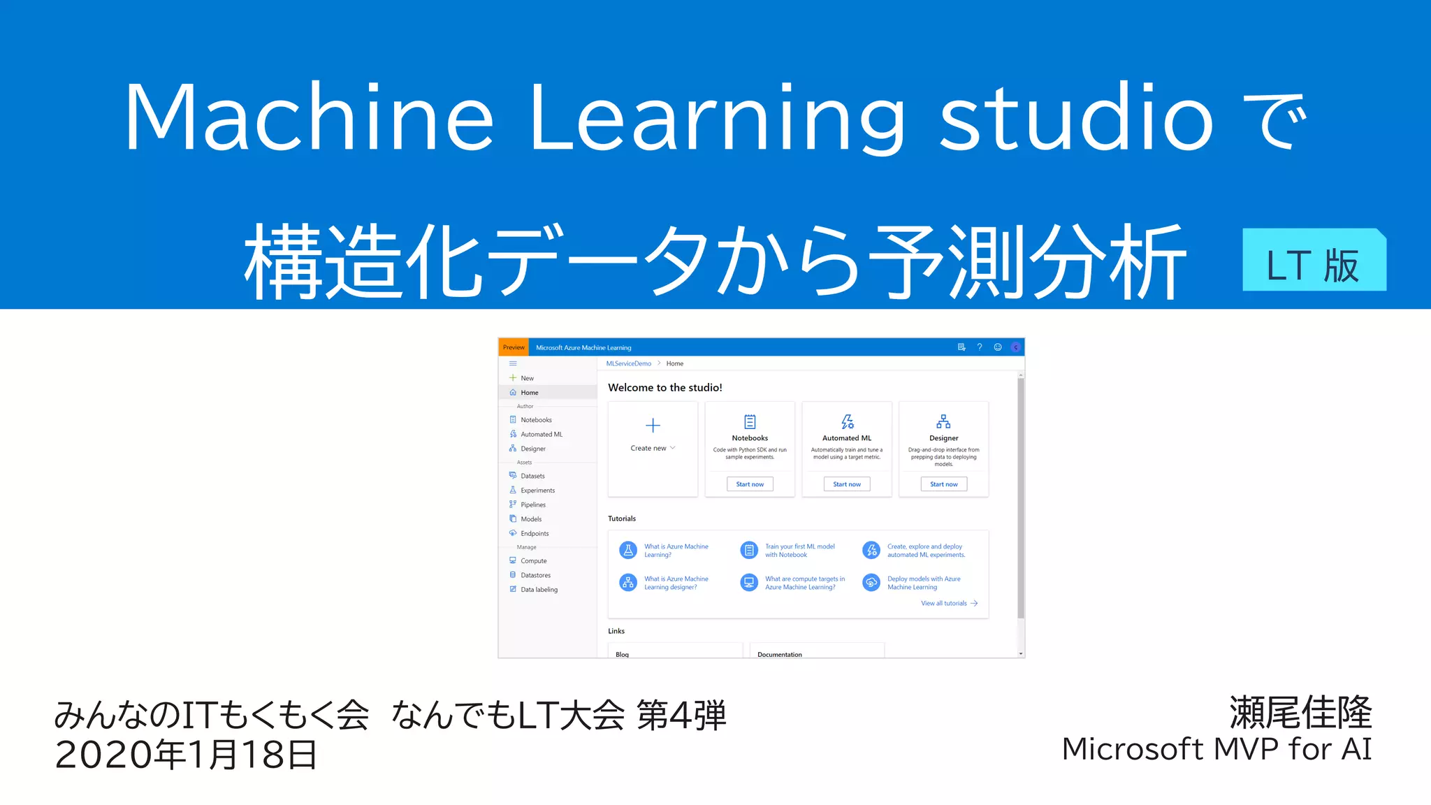 みんなのITもくもく会 なんでもLT大会 第4弾(2020年1月18日開催) LT資料 Azure Machine Learning studio の Automated ML で構造化データを学習・分析します