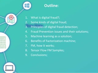 The document discusses digital marketing fraud, detailing its types, prevention principles, and the role of machine learning in real-time fraud detection. It highlights specific algorithms such as factorization machines and outlines their advantages in handling high-dimensional and sparse data for effective fraud prediction. The conclusion emphasizes the need for continuous improvement in predictive modeling accuracy to combat evolving fraud strategies.