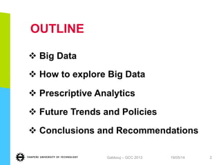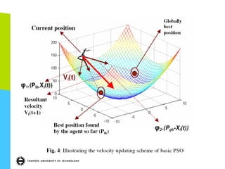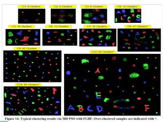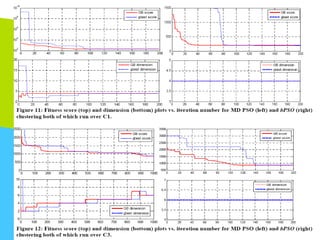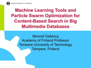 This document discusses machine learning tools and particle swarm optimization for content-based search in large multimedia databases. It begins with an outline and then covers topics like big data sources and characteristics, descriptive and prescriptive analytics using tools like particle swarm optimization, and methods for exploring big data including content-based image retrieval. It also discusses challenges like optimization of non-convex problems and proposes methods like multi-dimensional particle swarm optimization to address issues like premature convergence.